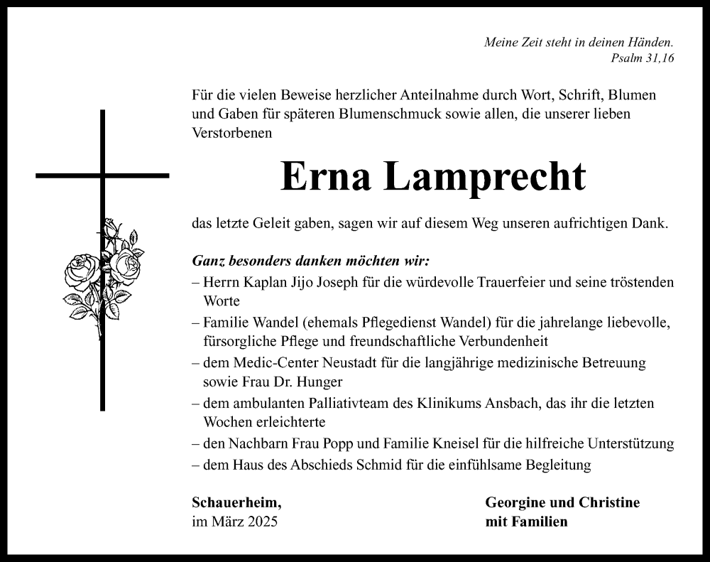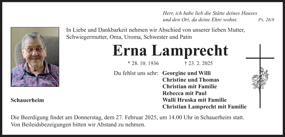 Hier finden Sie alle Traueranzeigen aus der Zeitung, die bisher für Erna Lamprecht erschienen sind. Weitere Traueranzeigen, die in der Zeitung erscheinen, werden hier ebenfalls aufgelistet