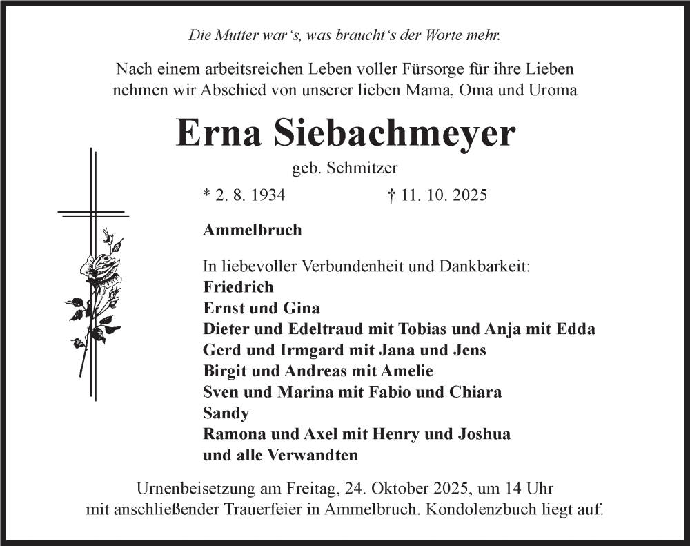 Hier finden Sie alle Traueranzeigen aus der Zeitung, die bisher für Erna Siebachmeyer erschienen sind. Weitere Traueranzeigen, die in der Zeitung erscheinen, werden hier ebenfalls aufgelistet