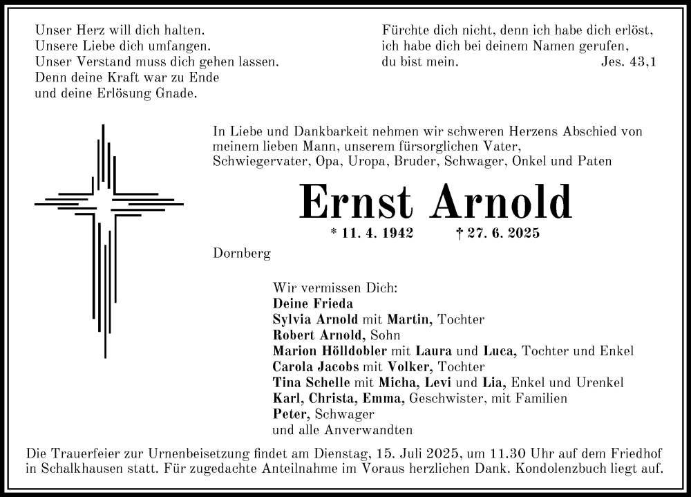 Hier finden Sie alle Traueranzeigen aus der Zeitung, die bisher für Ernst Arnold erschienen sind. Weitere Traueranzeigen, die in der Zeitung erscheinen, werden hier ebenfalls aufgelistet