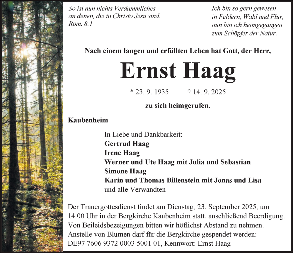 Hier finden Sie alle Traueranzeigen aus der Zeitung, die bisher für Ernst Haag erschienen sind. Weitere Traueranzeigen, die in der Zeitung erscheinen, werden hier ebenfalls aufgelistet