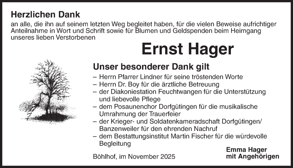 Hier finden Sie alle Traueranzeigen aus der Zeitung, die bisher für Ernst Hager erschienen sind. Weitere Traueranzeigen, die in der Zeitung erscheinen, werden hier ebenfalls aufgelistet