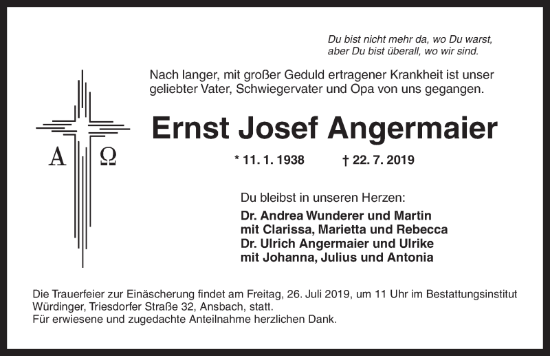Hier finden Sie alle Traueranzeigen aus der Zeitung, die bisher für Ernst Josef Angermaier erschienen sind. Weitere Traueranzeigen, die in der Zeitung erscheinen, werden hier ebenfalls aufgelistet