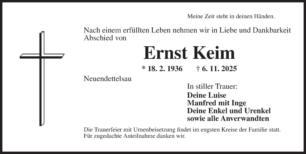 Hier finden Sie alle Traueranzeigen aus der Zeitung, die bisher für Ernst Keim erschienen sind. Weitere Traueranzeigen, die in der Zeitung erscheinen, werden hier ebenfalls aufgelistet