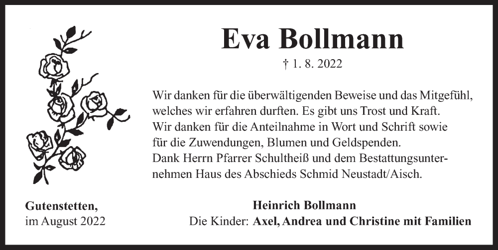 Hier finden Sie alle Traueranzeigen aus der Zeitung, die bisher für Eva Bollmann erschienen sind. Weitere Traueranzeigen, die in der Zeitung erscheinen, werden hier ebenfalls aufgelistet