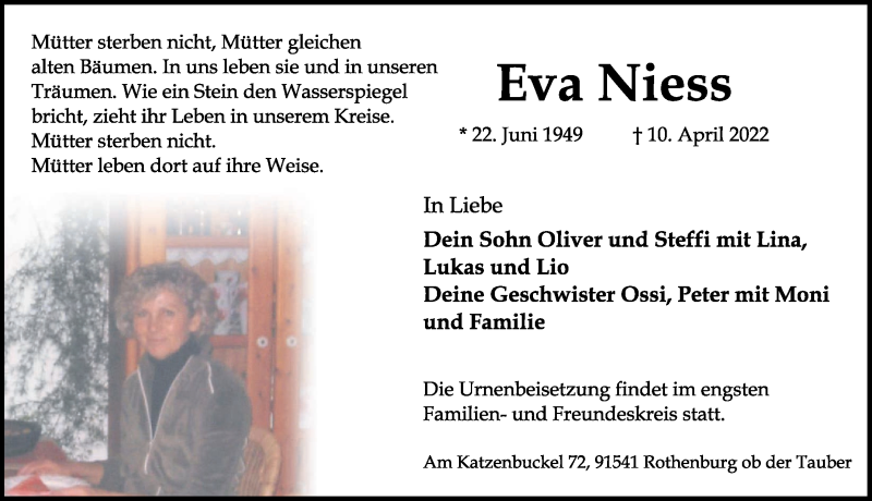Hier finden Sie alle Traueranzeigen aus der Zeitung, die bisher für Eva Niess erschienen sind. Weitere Traueranzeigen, die in der Zeitung erscheinen, werden hier ebenfalls aufgelistet