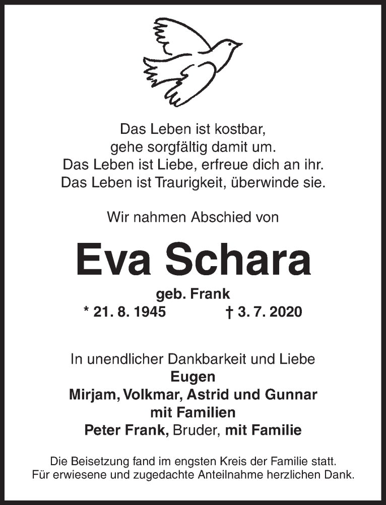 Hier finden Sie alle Traueranzeigen aus der Zeitung, die bisher für Eva Schara erschienen sind. Weitere Traueranzeigen, die in der Zeitung erscheinen, werden hier ebenfalls aufgelistet