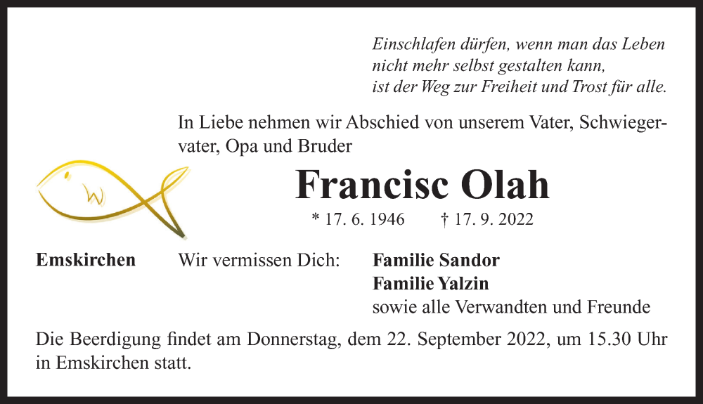 Hier finden Sie alle Traueranzeigen aus der Zeitung, die bisher für Francisc Olah erschienen sind. Weitere Traueranzeigen, die in der Zeitung erscheinen, werden hier ebenfalls aufgelistet