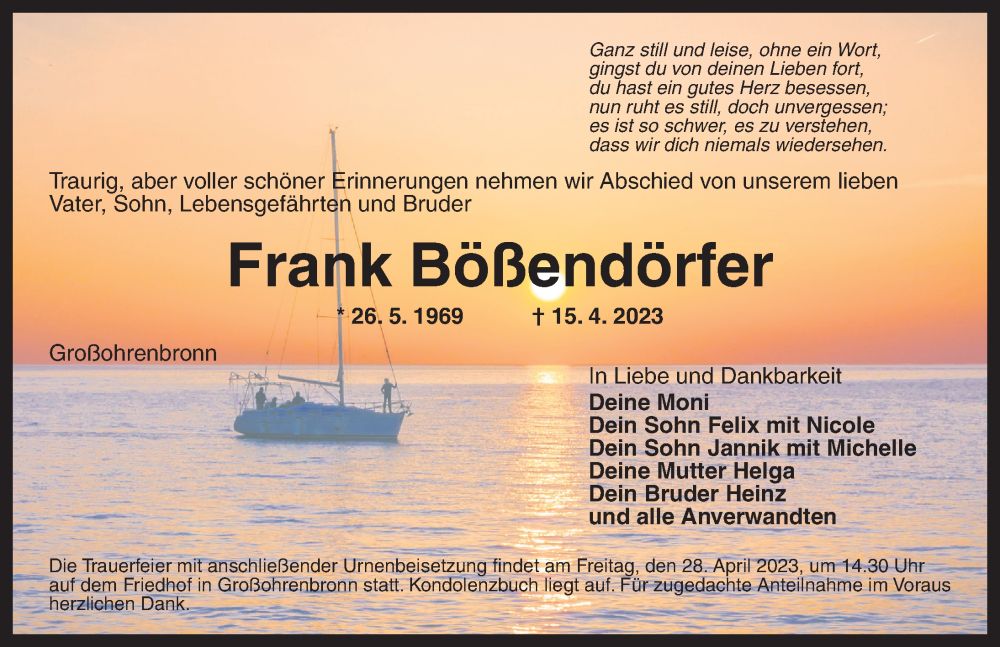 Hier finden Sie alle Traueranzeigen aus der Zeitung, die bisher für Frank Bößendörfer erschienen sind. Weitere Traueranzeigen, die in der Zeitung erscheinen, werden hier ebenfalls aufgelistet