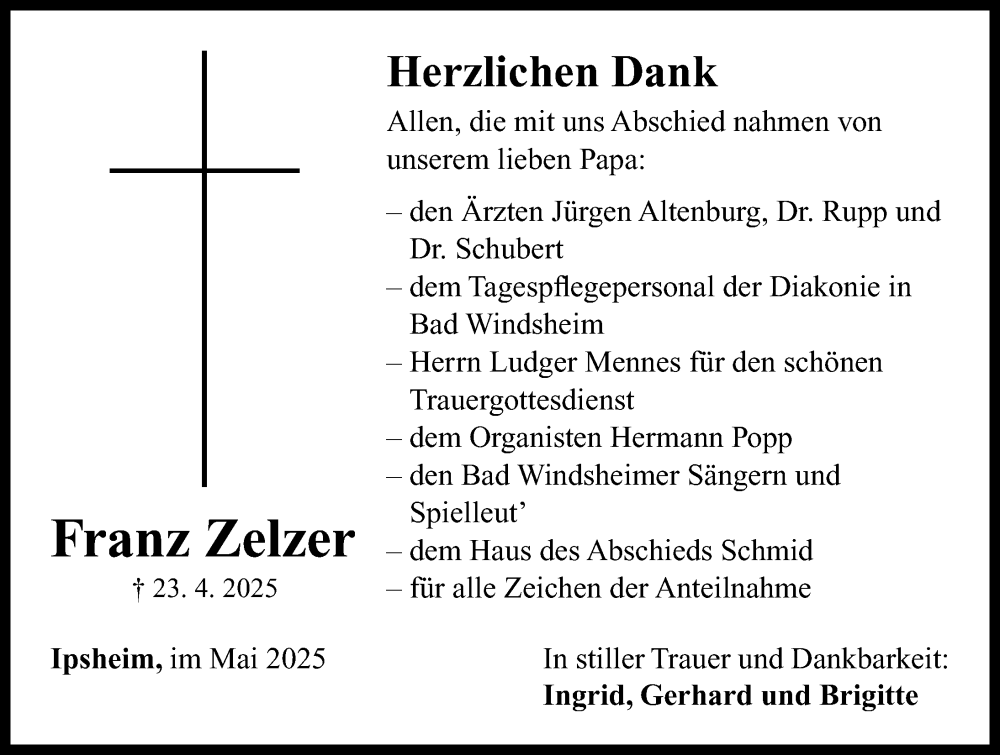 Hier finden Sie alle Traueranzeigen aus der Zeitung, die bisher für Franz Zelzer erschienen sind. Weitere Traueranzeigen, die in der Zeitung erscheinen, werden hier ebenfalls aufgelistet