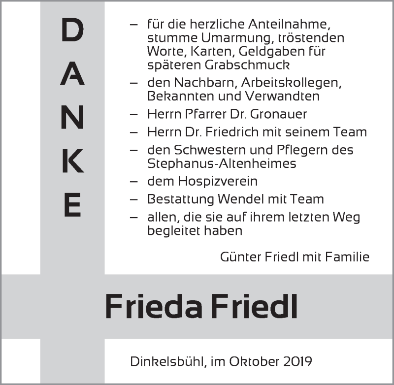 Hier finden Sie alle Traueranzeigen aus der Zeitung, die bisher für Frieda Friedl erschienen sind. Weitere Traueranzeigen, die in der Zeitung erscheinen, werden hier ebenfalls aufgelistet