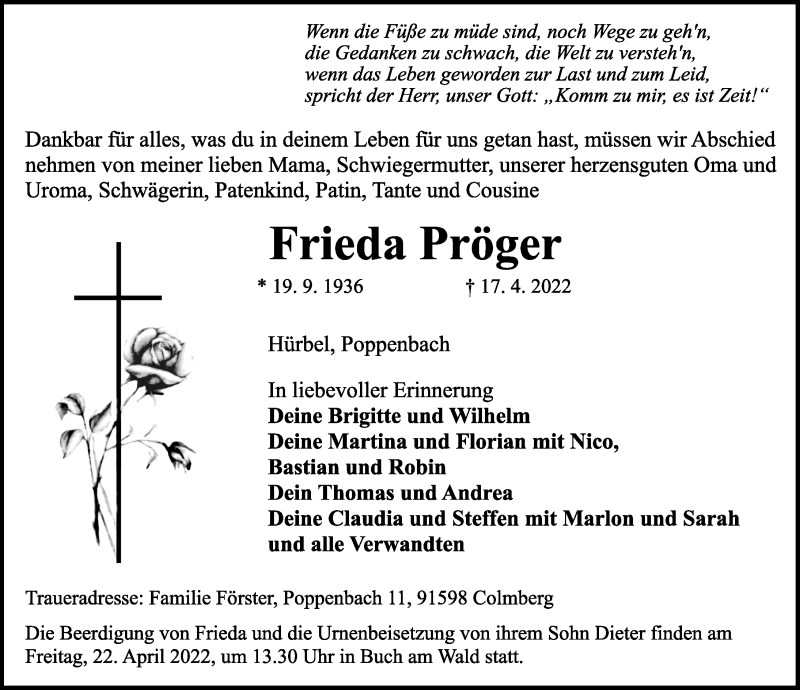 Hier finden Sie alle Traueranzeigen aus der Zeitung, die bisher für Frieda Pröger erschienen sind. Weitere Traueranzeigen, die in der Zeitung erscheinen, werden hier ebenfalls aufgelistet