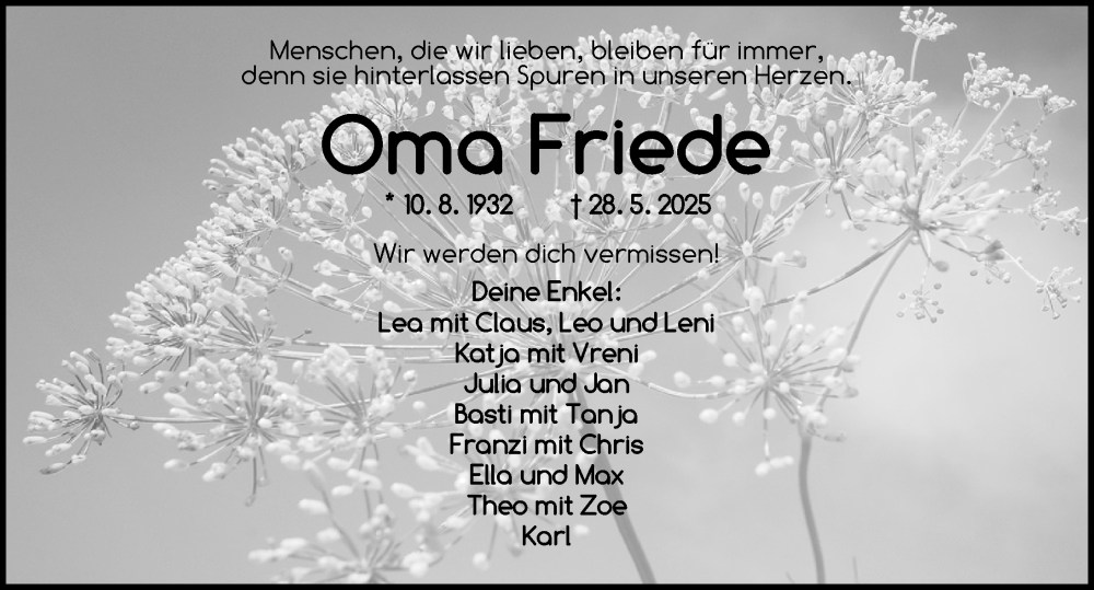 Hier finden Sie alle Traueranzeigen aus der Zeitung, die bisher für Friede erschienen sind. Weitere Traueranzeigen, die in der Zeitung erscheinen, werden hier ebenfalls aufgelistet