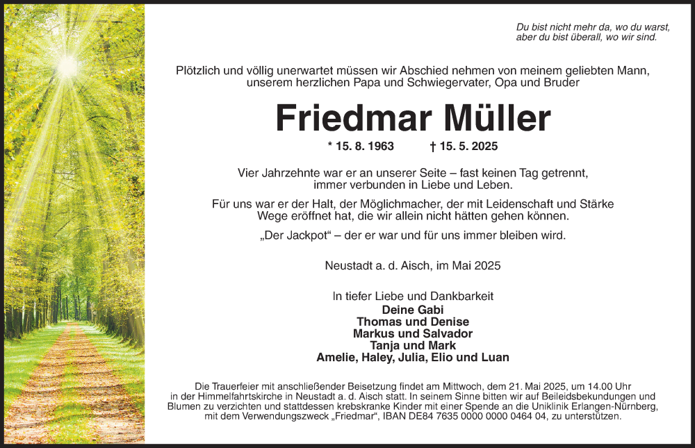 Hier finden Sie alle Traueranzeigen aus der Zeitung, die bisher für Friedmar Müller erschienen sind. Weitere Traueranzeigen, die in der Zeitung erscheinen, werden hier ebenfalls aufgelistet