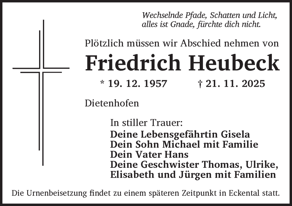 Hier finden Sie alle Traueranzeigen aus der Zeitung, die bisher für Friedrich Heubeck erschienen sind. Weitere Traueranzeigen, die in der Zeitung erscheinen, werden hier ebenfalls aufgelistet