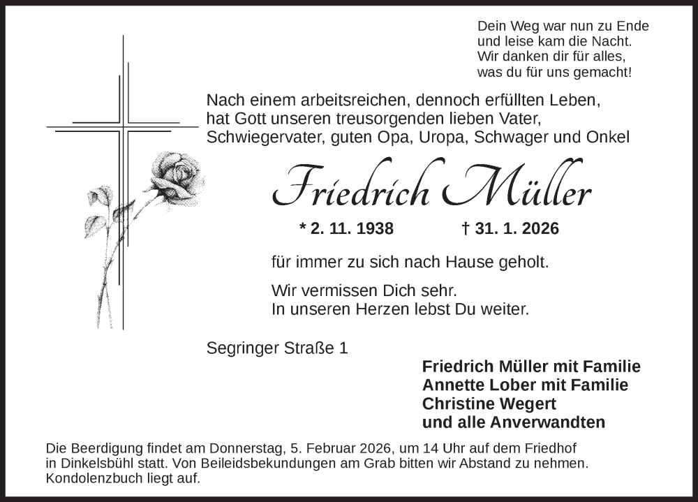 Hier finden Sie alle Traueranzeigen aus der Zeitung, die bisher für Friedrich Müller erschienen sind. Weitere Traueranzeigen, die in der Zeitung erscheinen, werden hier ebenfalls aufgelistet
