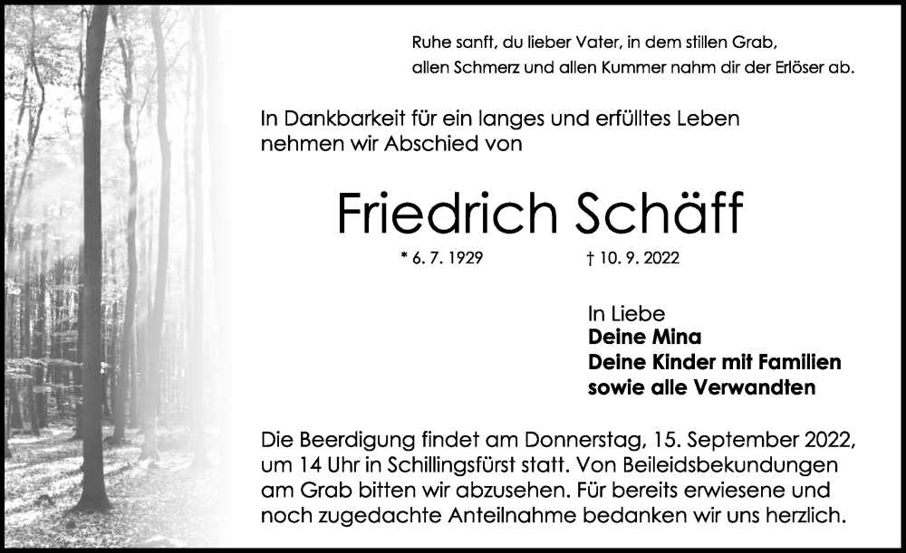 Hier finden Sie alle Traueranzeigen aus der Zeitung, die bisher für Friedrich Schäff erschienen sind. Weitere Traueranzeigen, die in der Zeitung erscheinen, werden hier ebenfalls aufgelistet