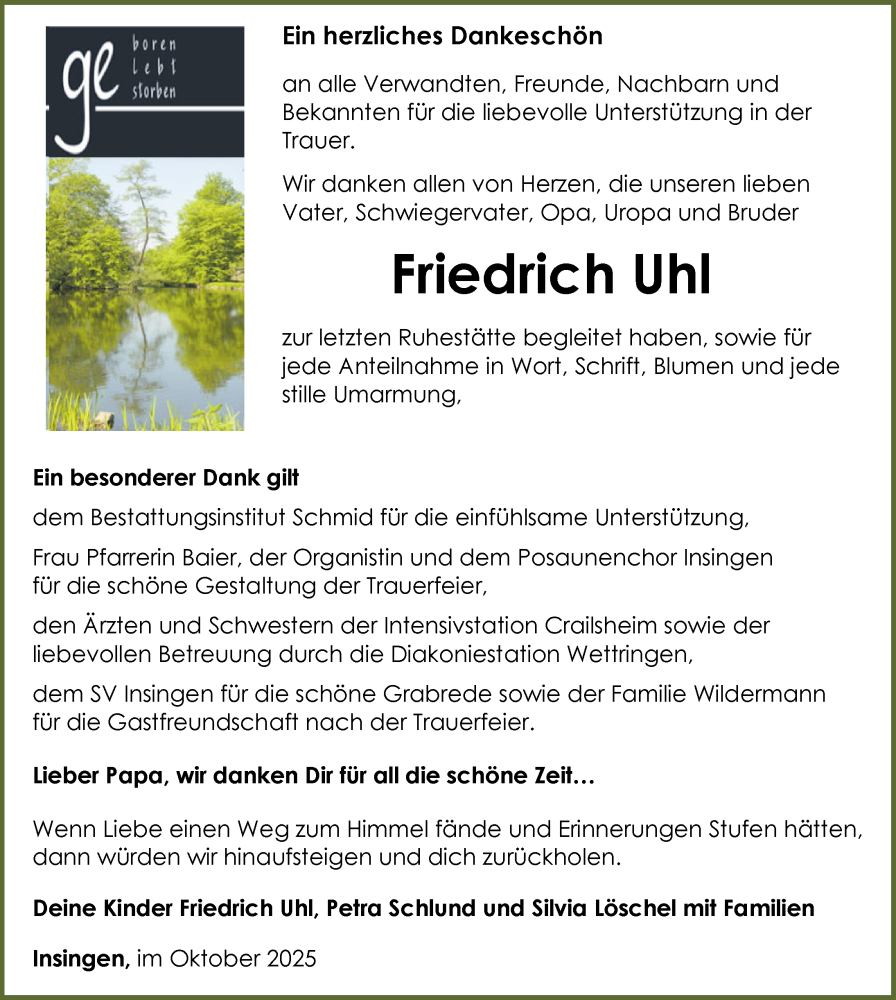 Hier finden Sie alle Traueranzeigen aus der Zeitung, die bisher für Friedrich Uhl erschienen sind. Weitere Traueranzeigen, die in der Zeitung erscheinen, werden hier ebenfalls aufgelistet