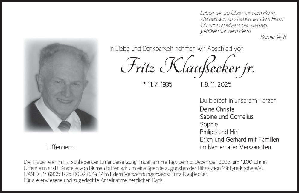 Hier finden Sie alle Traueranzeigen aus der Zeitung, die bisher für Fritz Klaußecker erschienen sind. Weitere Traueranzeigen, die in der Zeitung erscheinen, werden hier ebenfalls aufgelistet