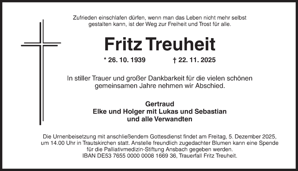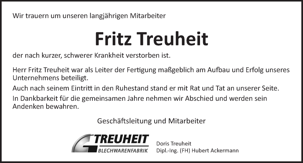 Hier finden Sie alle Traueranzeigen aus der Zeitung, die bisher für Fritz Treuheit erschienen sind. Weitere Traueranzeigen, die in der Zeitung erscheinen, werden hier ebenfalls aufgelistet