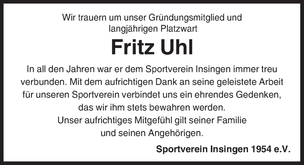Hier finden Sie alle Traueranzeigen aus der Zeitung, die bisher für Fritz Uhl erschienen sind. Weitere Traueranzeigen, die in der Zeitung erscheinen, werden hier ebenfalls aufgelistet
