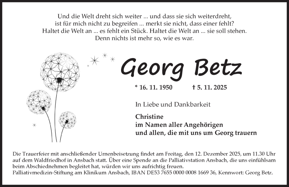 Hier finden Sie alle Traueranzeigen aus der Zeitung, die bisher für Georg Betz erschienen sind. Weitere Traueranzeigen, die in der Zeitung erscheinen, werden hier ebenfalls aufgelistet
