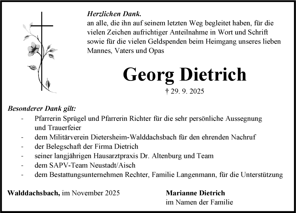 Hier finden Sie alle Traueranzeigen aus der Zeitung, die bisher für Georg Dietrich erschienen sind. Weitere Traueranzeigen, die in der Zeitung erscheinen, werden hier ebenfalls aufgelistet