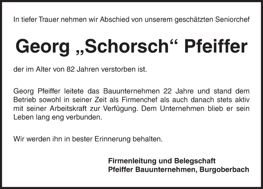 Hier finden Sie alle Traueranzeigen aus der Zeitung, die bisher für Georg Pfeiffer erschienen sind. Weitere Traueranzeigen, die in der Zeitung erscheinen, werden hier ebenfalls aufgelistet