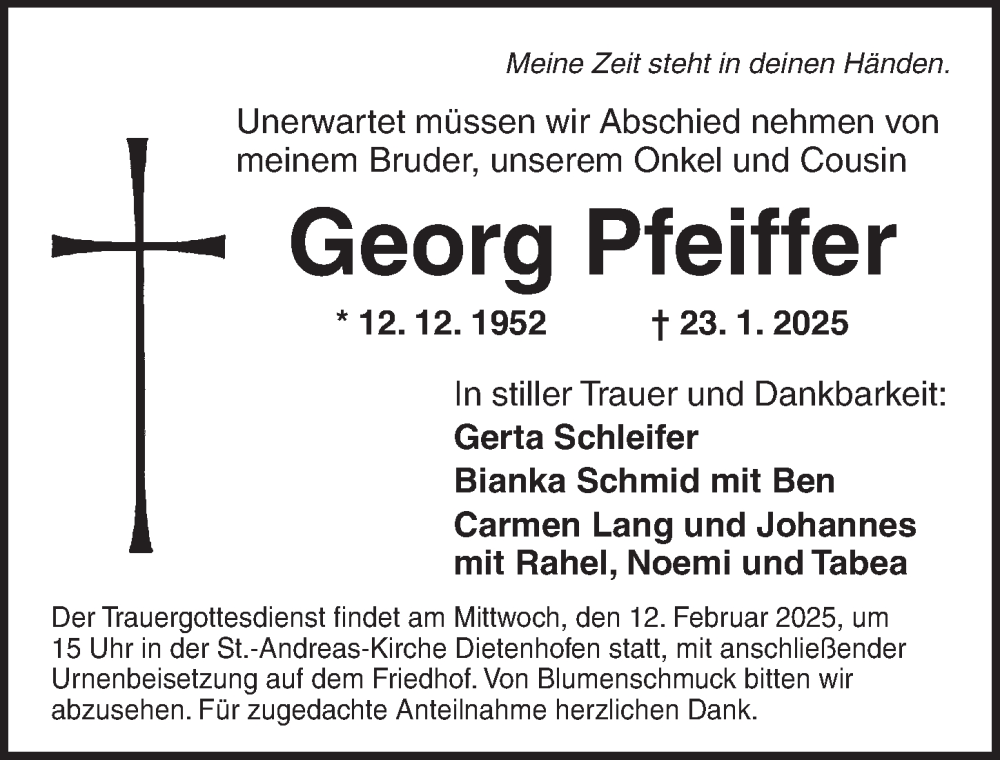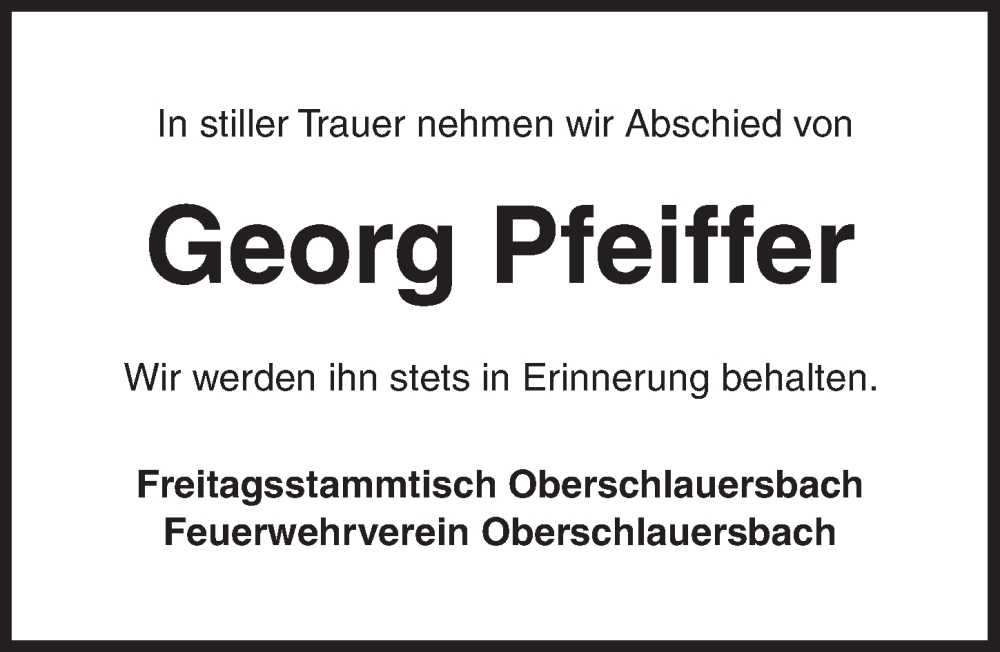 Hier finden Sie alle Traueranzeigen aus der Zeitung, die bisher für Georg Pfeiffer erschienen sind. Weitere Traueranzeigen, die in der Zeitung erscheinen, werden hier ebenfalls aufgelistet