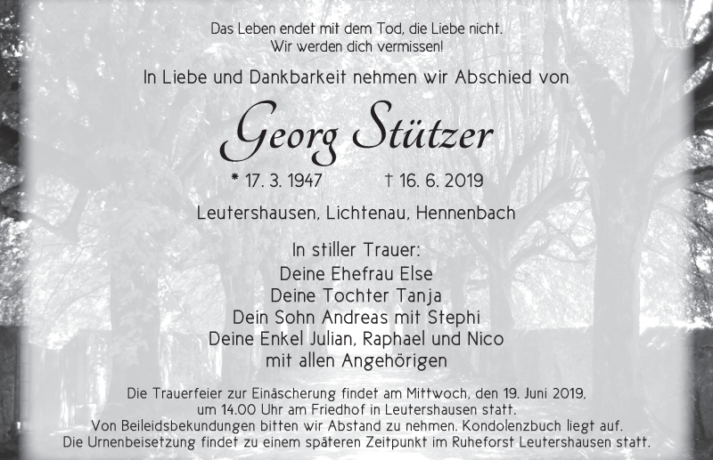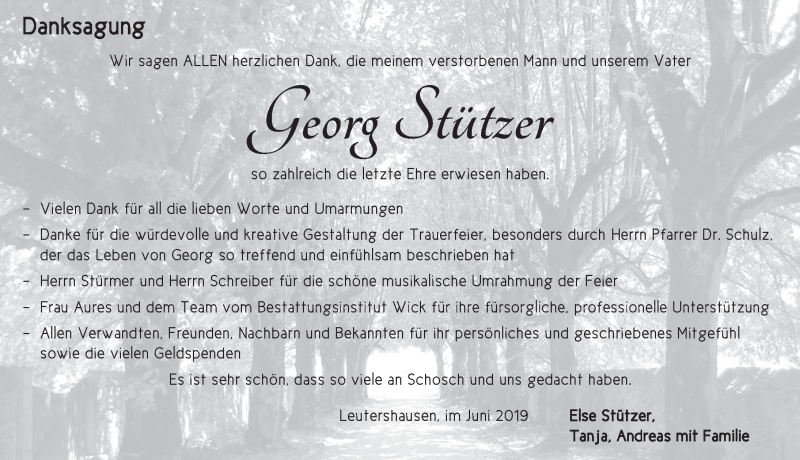 Hier finden Sie alle Traueranzeigen aus der Zeitung, die bisher für Georg Stützer erschienen sind. Weitere Traueranzeigen, die in der Zeitung erscheinen, werden hier ebenfalls aufgelistet