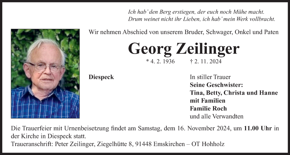 Hier finden Sie alle Traueranzeigen aus der Zeitung, die bisher für Georg Zeilinger erschienen sind. Weitere Traueranzeigen, die in der Zeitung erscheinen, werden hier ebenfalls aufgelistet