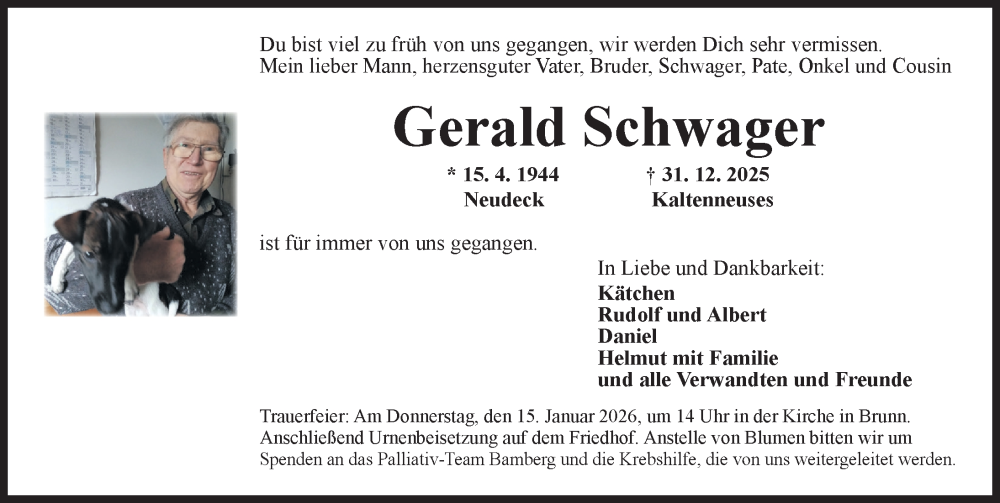 Hier finden Sie alle Traueranzeigen aus der Zeitung, die bisher für Gerald Schwager erschienen sind. Weitere Traueranzeigen, die in der Zeitung erscheinen, werden hier ebenfalls aufgelistet
