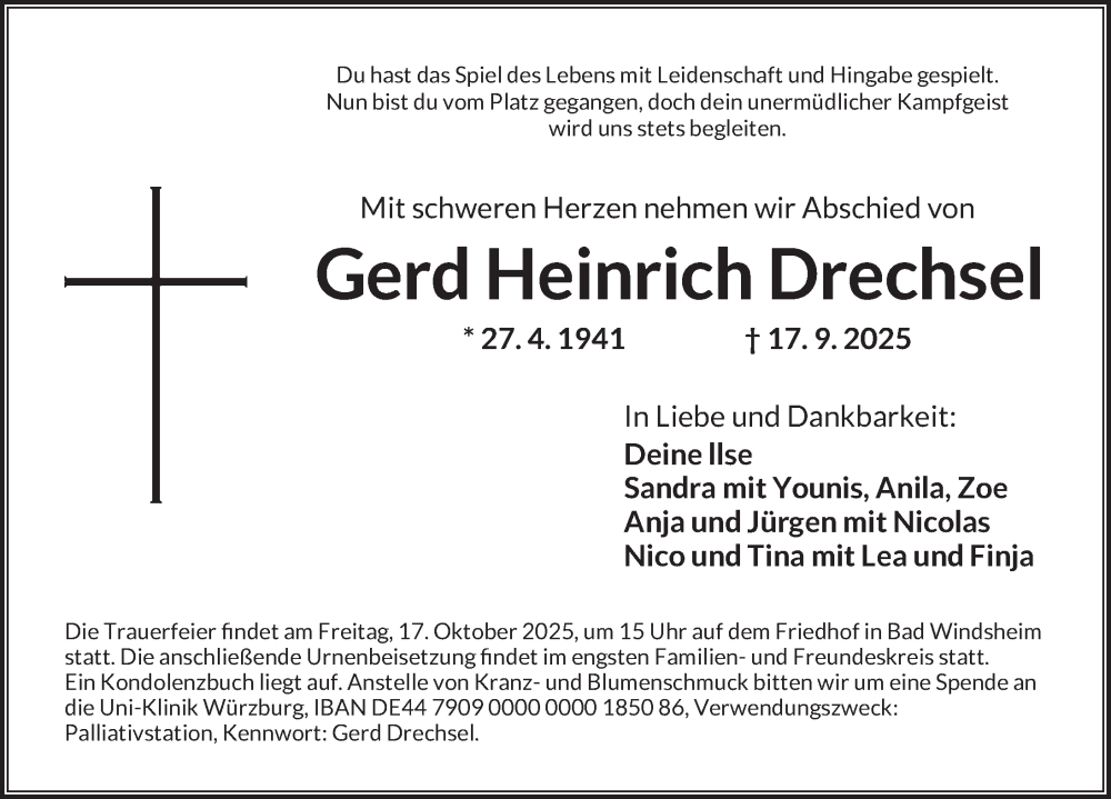 Hier finden Sie alle Traueranzeigen aus der Zeitung, die bisher für Gerd Heinrich Drechsel erschienen sind. Weitere Traueranzeigen, die in der Zeitung erscheinen, werden hier ebenfalls aufgelistet