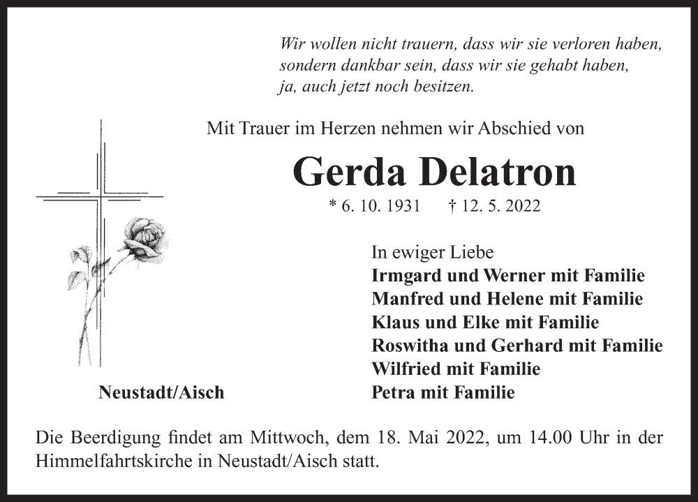 Hier finden Sie alle Traueranzeigen aus der Zeitung, die bisher für Gerda Delatron erschienen sind. Weitere Traueranzeigen, die in der Zeitung erscheinen, werden hier ebenfalls aufgelistet