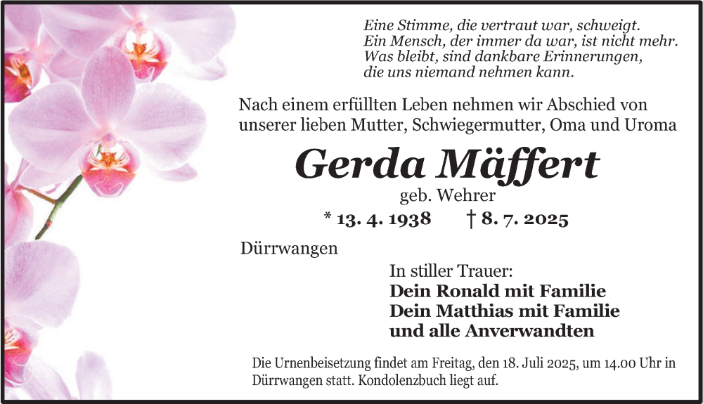 Hier finden Sie alle Traueranzeigen aus der Zeitung, die bisher für Gerda Mäffert erschienen sind. Weitere Traueranzeigen, die in der Zeitung erscheinen, werden hier ebenfalls aufgelistet