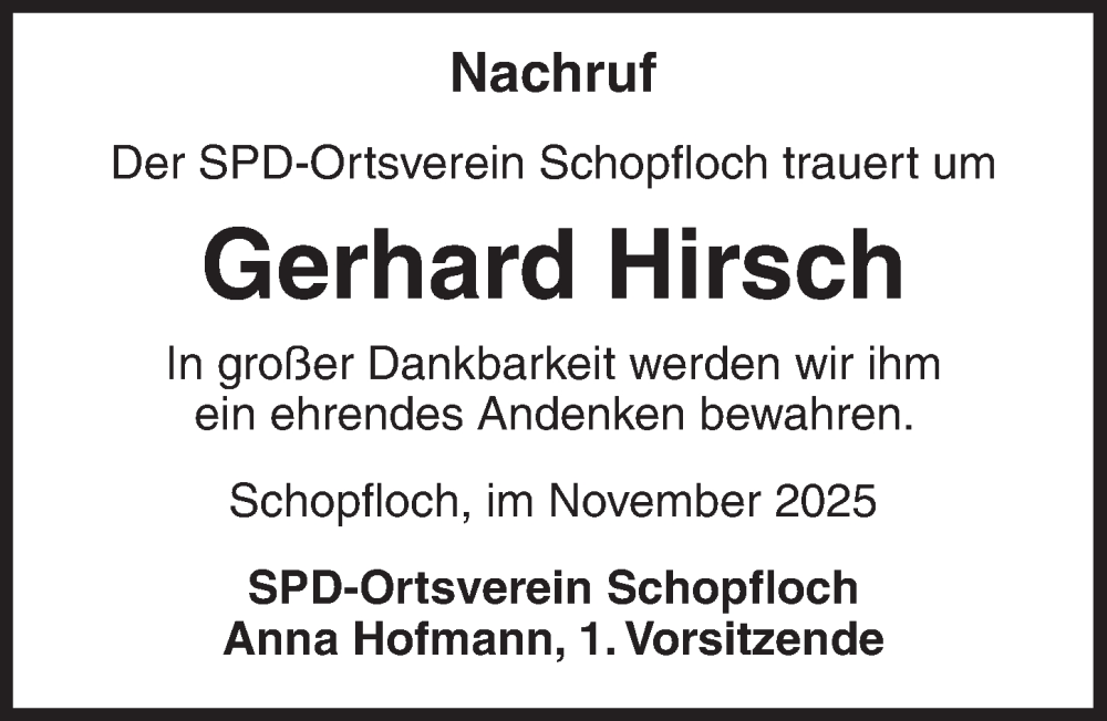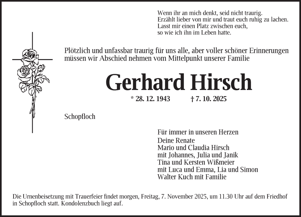 Hier finden Sie alle Traueranzeigen aus der Zeitung, die bisher für Gerhard Hirsch erschienen sind. Weitere Traueranzeigen, die in der Zeitung erscheinen, werden hier ebenfalls aufgelistet