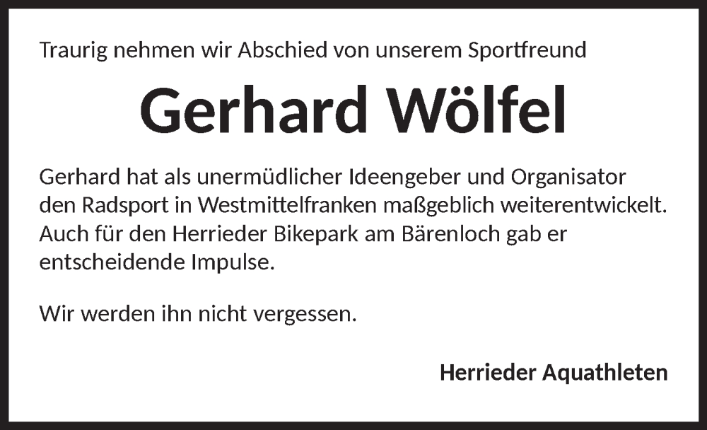 Hier finden Sie alle Traueranzeigen aus der Zeitung, die bisher für Gerhard Wölfel erschienen sind. Weitere Traueranzeigen, die in der Zeitung erscheinen, werden hier ebenfalls aufgelistet