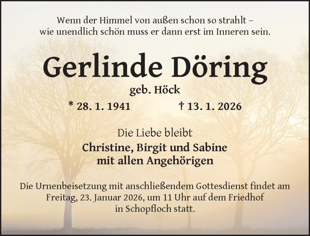 Hier finden Sie alle Traueranzeigen aus der Zeitung, die bisher für Gerlinde Döring erschienen sind. Weitere Traueranzeigen, die in der Zeitung erscheinen, werden hier ebenfalls aufgelistet