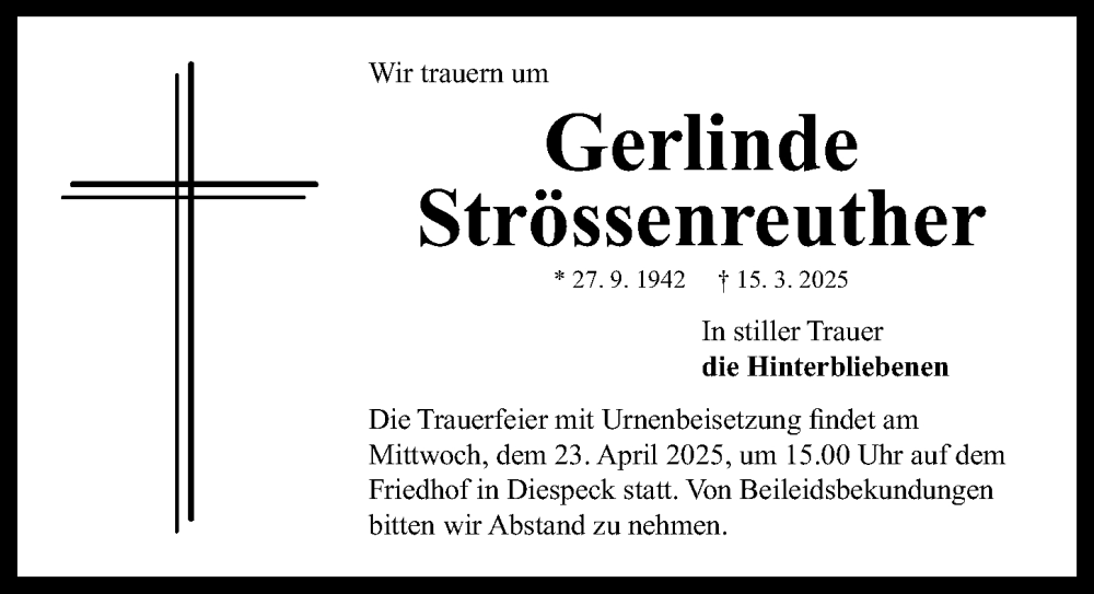Hier finden Sie alle Traueranzeigen aus der Zeitung, die bisher für Gerlinde Strössenreuther erschienen sind. Weitere Traueranzeigen, die in der Zeitung erscheinen, werden hier ebenfalls aufgelistet