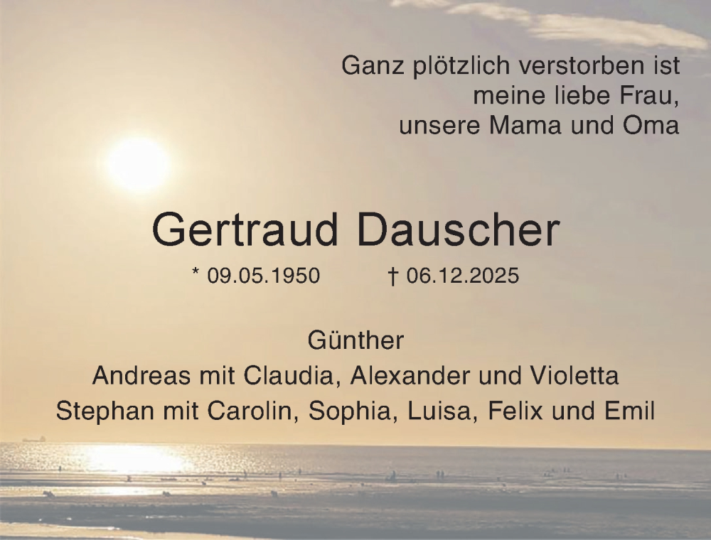 Hier finden Sie alle Traueranzeigen aus der Zeitung, die bisher für Gertraud Dauscher erschienen sind. Weitere Traueranzeigen, die in der Zeitung erscheinen, werden hier ebenfalls aufgelistet