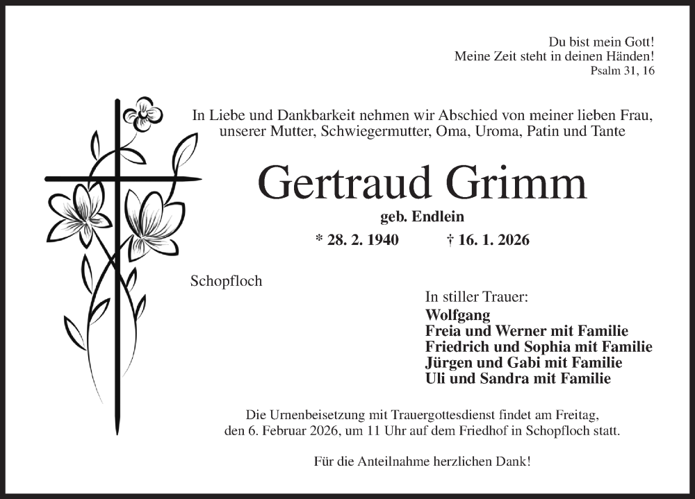 Hier finden Sie alle Traueranzeigen aus der Zeitung, die bisher für Gertraud Grimm erschienen sind. Weitere Traueranzeigen, die in der Zeitung erscheinen, werden hier ebenfalls aufgelistet