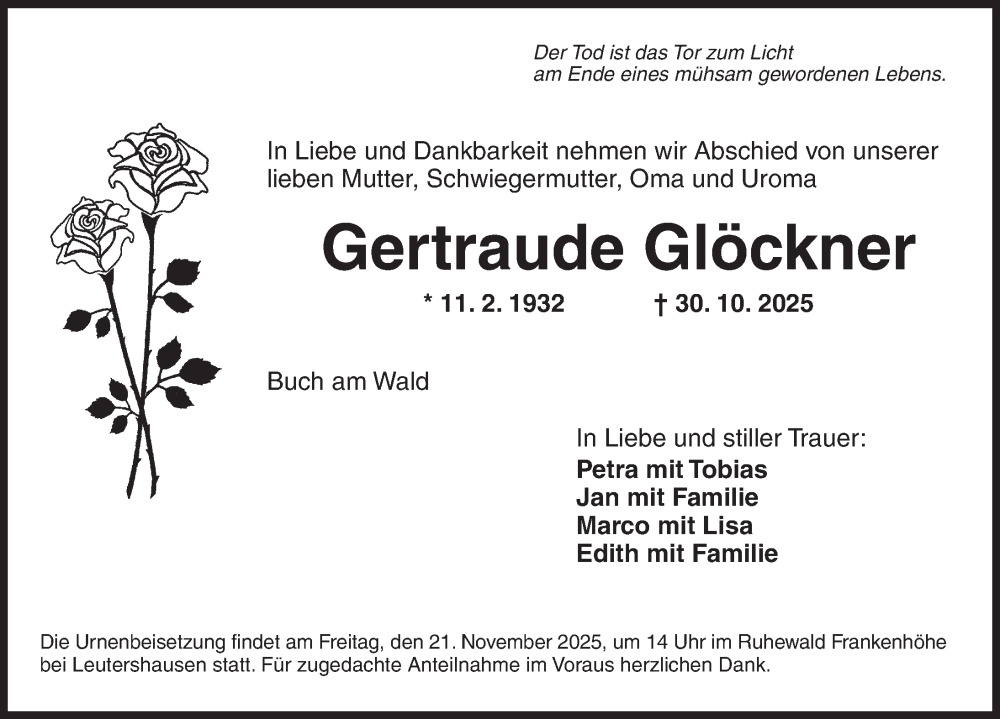 Hier finden Sie alle Traueranzeigen aus der Zeitung, die bisher für Gertraude Glöckner erschienen sind. Weitere Traueranzeigen, die in der Zeitung erscheinen, werden hier ebenfalls aufgelistet