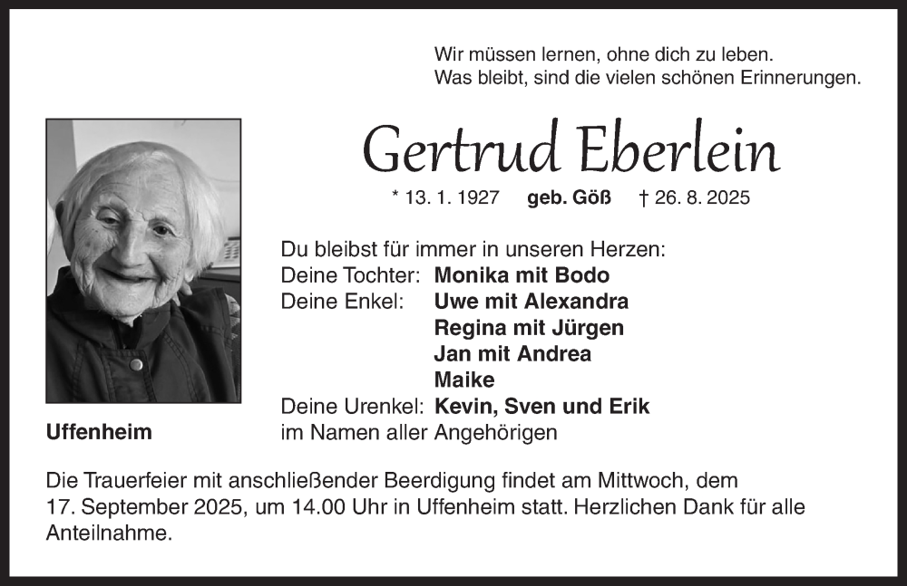Hier finden Sie alle Traueranzeigen aus der Zeitung, die bisher für Gertrud Eberlein erschienen sind. Weitere Traueranzeigen, die in der Zeitung erscheinen, werden hier ebenfalls aufgelistet