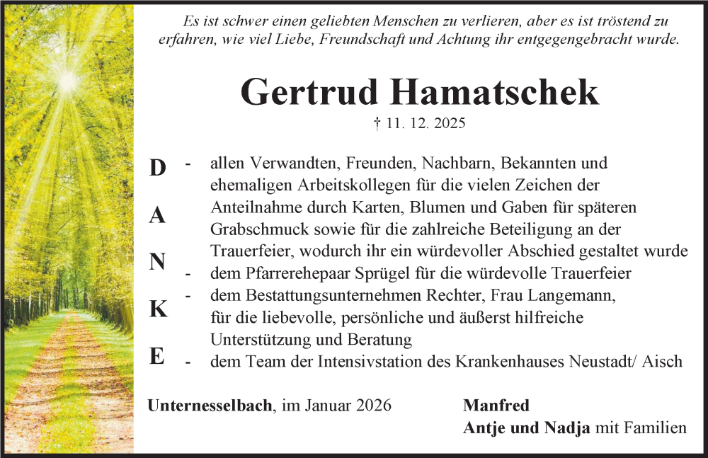 Hier finden Sie alle Traueranzeigen aus der Zeitung, die bisher für Gertrud Hamatschek erschienen sind. Weitere Traueranzeigen, die in der Zeitung erscheinen, werden hier ebenfalls aufgelistet
