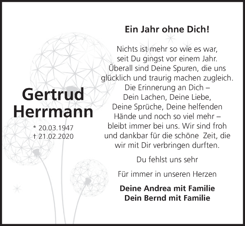 Hier finden Sie alle Traueranzeigen aus der Zeitung, die bisher für Gertrud Herrmann erschienen sind. Weitere Traueranzeigen, die in der Zeitung erscheinen, werden hier ebenfalls aufgelistet
