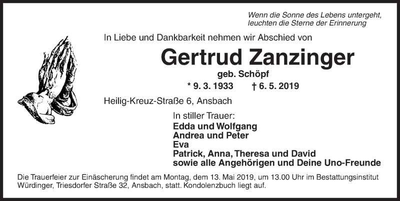Hier finden Sie alle Traueranzeigen aus der Zeitung, die bisher für Gertrud Zanzinger erschienen sind. Weitere Traueranzeigen, die in der Zeitung erscheinen, werden hier ebenfalls aufgelistet