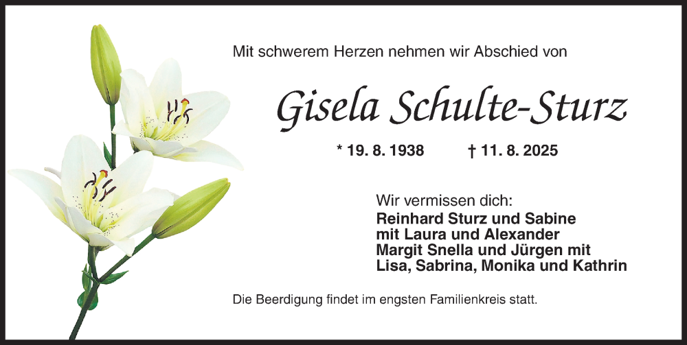 Hier finden Sie alle Traueranzeigen aus der Zeitung, die bisher für Gisela Schulte-Sturz erschienen sind. Weitere Traueranzeigen, die in der Zeitung erscheinen, werden hier ebenfalls aufgelistet
