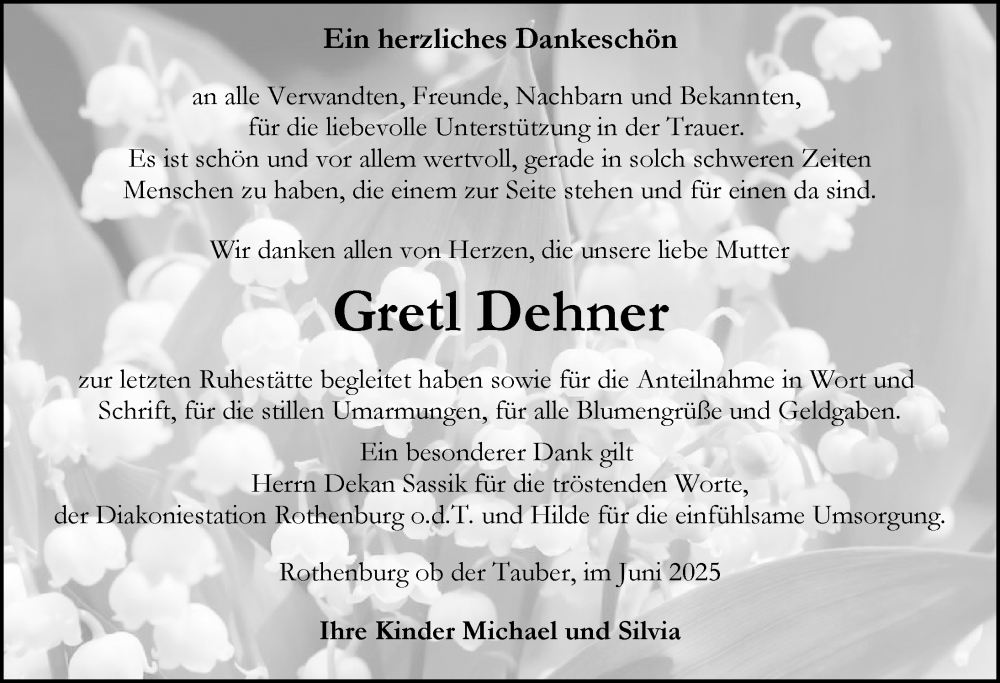 Hier finden Sie alle Traueranzeigen aus der Zeitung, die bisher für Gretl Dehner erschienen sind. Weitere Traueranzeigen, die in der Zeitung erscheinen, werden hier ebenfalls aufgelistet