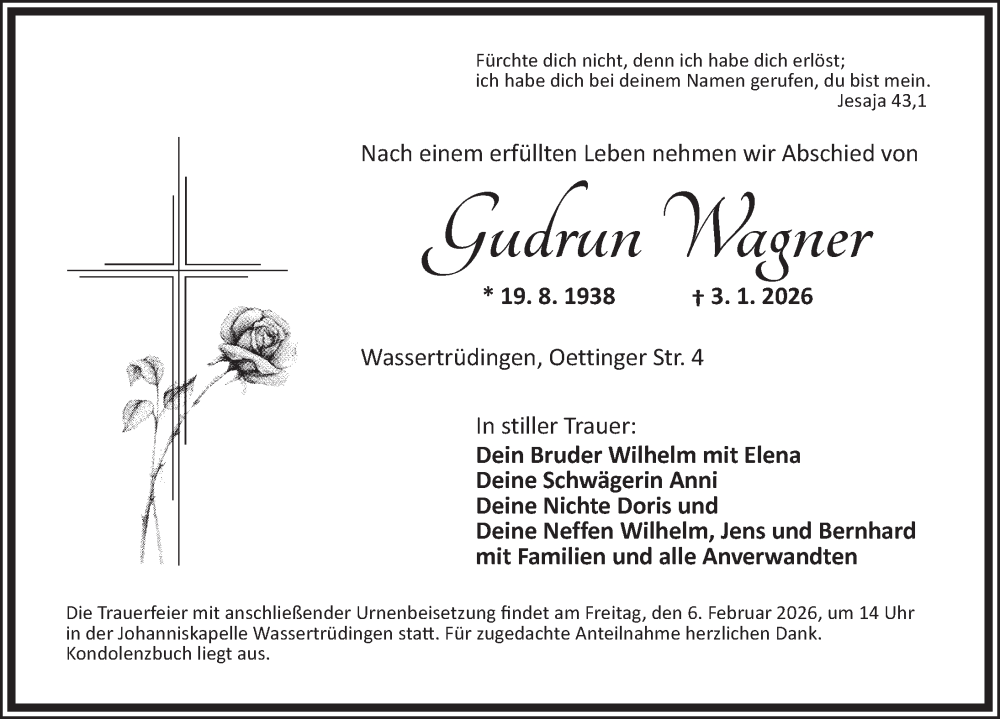 Hier finden Sie alle Traueranzeigen aus der Zeitung, die bisher für Gudrun Wagner erschienen sind. Weitere Traueranzeigen, die in der Zeitung erscheinen, werden hier ebenfalls aufgelistet