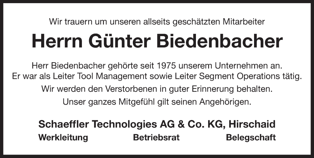 Hier finden Sie alle Traueranzeigen aus der Zeitung, die bisher für Günter Biedenbacher erschienen sind. Weitere Traueranzeigen, die in der Zeitung erscheinen, werden hier ebenfalls aufgelistet