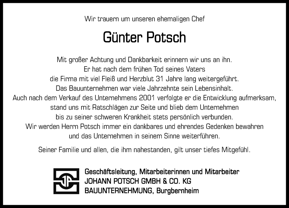 Hier finden Sie alle Traueranzeigen aus der Zeitung, die bisher für Günter Potsch erschienen sind. Weitere Traueranzeigen, die in der Zeitung erscheinen, werden hier ebenfalls aufgelistet